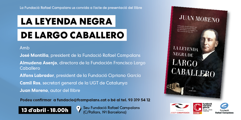 El pasado 13 de abril, la Fundació Rafael Campalans celebró un acto de presentación del libro, con la participación del autor, Juan Moreno, así como de José Montilla, presidente de la Fundació; Almudena Asenjo, presidenta de la Fundación Francisco Largo Caballero; Alfons Labrador, presidente de la Fundación Cipriano García y Camil Ros, secretario general de la UGT en Cataluña.